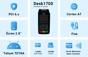 Le Desk 1700 arbore un design plus compact et moderne par rapport à son prédécesseur, le Desk 1600. Ainsi, il s’intègre plus facilement à tous types de comptoirs. De plus, sa conception ergonomique facilite son utilisation tant pour les commerçants que pour les clients, ce qui offre une meilleure expérience utilisateur. Par ailleurs, le nouveau modèle est équipé d’un écran tactile couleur HVGA de 2,8 pouces avec une lentille en verre, garantissant ainsi une meilleure résistance aux chocs et une lisibilité accrue.