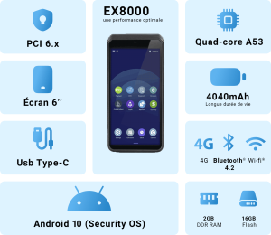 L’Ingenico AXIUM EX8000 est un terminal de paiement mobile de nouvelle génération. Il est conçu pour offrir une flexibilité maximale aux commerçants. Ce dispositif compact et léger (290g) fonctionne sous Android 10 et ressemble à un smartphone haut de gamme avec son écran tactile HD+ de 6 pouces et son design ergonomique. Il intègre des fonctionnalités avancées de paiement tout en offrant des caractéristiques typiques des smartphones modernes. En effet, il dispose d’un processeur quad-core puissant, jusqu’à 3 Go de RAM et 32 Go de stockage interne . L’AXIUM EX8000 dispose de caméras avant (2 MP) et arrière (8 MP) avec flash. Ce qui lui permet de lire les codes-barres et la capture d’images tout en intégrant des fonctionnalités avancées de paiement.