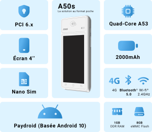 Le terminal A50s de Pax Technology est une solution de paiement Android en format poche. Il rassemble toute la technologie d’un terminal de paiement dans un format portable. Ce terminal de paiement simple et compact répond à tous les besoins des utilisateurs.