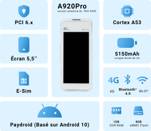 Le terminal bancaire PAX A920Pro est une version améliorée du terminal bancaire portable tactile PAX A920. En effet, l’A920 pro est un terminal de paiement intelligent sous Android doté de fonctions semblables à celles d’un smartphone afin de rendre son utilisation facile.