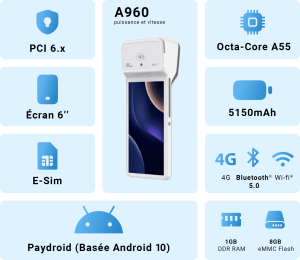 L’A960 dispose également de deux caméras et d’un scanner professionnel en option. Il peut donc être utilisé pour payer via les codes QR, les coupons et scanner les images produits. Il peut être connecté en Wifi, Bluetooth et 4G notamment via une e-sim qui est une carte électronique délivrée par un opérateur et qui remplace la carte SIM habituelle.