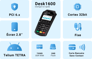 Le PIN Pad Desk 1600 offre une sécurité accrue avec sa certification PCI PTS v6. Il couvre toutes les méthodes de paiements et se concentre sur la validation sans contact. En effet, il dispose d’une zone sans contact clairement démarquée et facilement identifiable. Il accepte les paiements sans contact, carte à puce, piste magnétique…mais également de multiples méthodes de paiement alternative prises en charge. Il permet d’accélérer les paiements pour les terminaux Desk et est notamment compatible avec le terminal bancaire fixe Desk 5000.