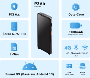 Il est équipé d’un processeur octa-core jusqu’à 2,4 GHz. De plus il possède une mémoire allant jusqu’à 8 Go de RAM et 128 Go de stockage. Le P3 Air assure une fluidité optimale pour toutes vos applications métiers. Ainsi sa connectivité avancée (Wi-Fi, 4G, eSIM multi-opérateurs, NFC double face) garantit des transactions rapides et sécurisées, où que vous soyez. Compatible avec toutes les méthodes de paiement (carte à puce, sans contact, QR code). Le P3 Air répond aux besoins variés des commerçants modernes. Certifié PCI PTS 6.X et EMV, il offre un haut niveau de sécurité pour vos transactions. Il bénéficie également d’une protection IP65, le rendant résistant à la poussière et aux projections d’eau.