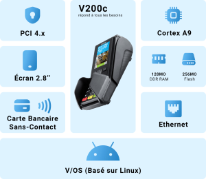 Le terminal bancaire V200C, avec son processeur puissant de 600 MHz, facilite des téléchargements et des opérations plus rapides. De plus, sa mémoire de 384 MB facilite la prise en charge d’applications commerciales. Enfin, le Verifone V200c prend en charge certaines applications de paiement pour garantir une bonne expérience et faciliter la gestion des transactions.