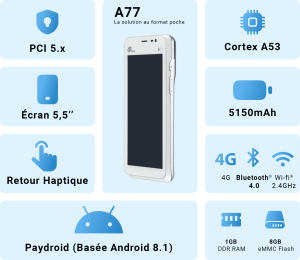 Le TPE A77 de Pax Technology, est un terminal bancaire portable tactile et intelligent doté d’une double caméra. Le Pax A77 fonctionne sous OS Android et se connecte en 4G, Wifi et Bluetooth. Il accepte tous les types de paiement contact et sans contact.