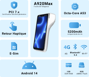 Le A920 Max est un terminal bancaire appartenant à Pax Technology, il s’agit d’une version améliorée des terminaux portable A920 et A920 pro. En effet, l’A920 Max intègre toutes les fonctionnalités et caractéristiques qui vont le succès de ses prédécesseurs avec des améliorations de performance et de fonctionnalités.