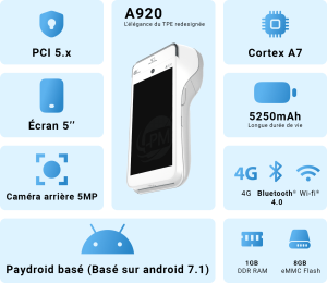 Le TPE A920 de Pax Technology un terminal bancaire portable tactile et intelligent doté d’une caméra haute définition. Il fonctionne sous OS Android et peut se connecter en 3G/4G, Wifi et Bluetooth. Il accepte tous les paiements contact et sans contact.